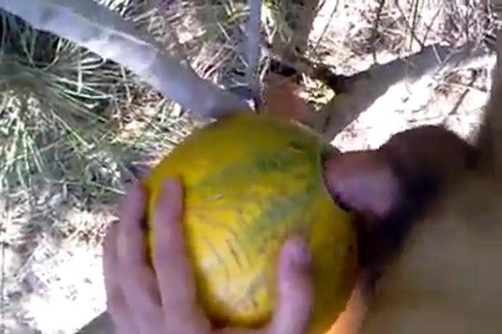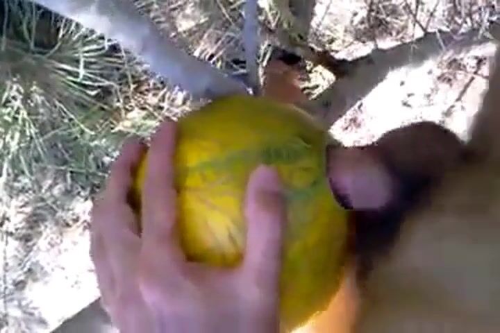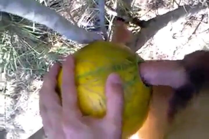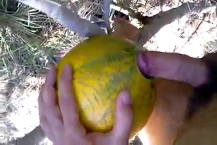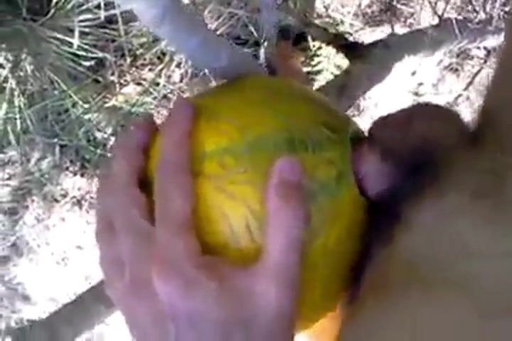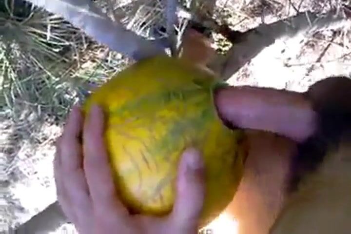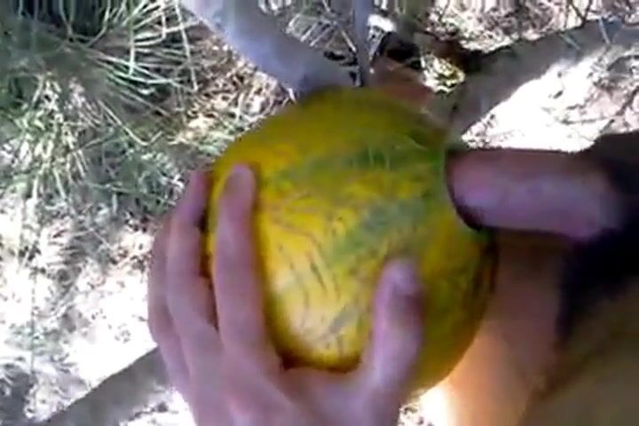 A horny man takes his sex toy outside and has some naughty fun with it, enjoying a solo masturbation session in nature. He uses a unique prop—a melon—to spice things up, creating an amateur video that's both erotic and playful.