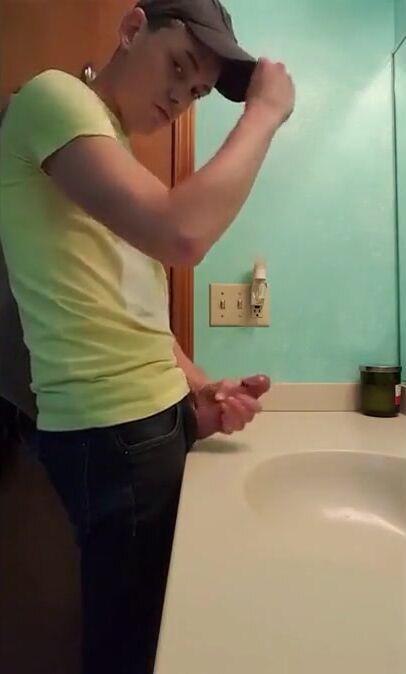 Description: a straight guy jerks off in bathroom with fat dick