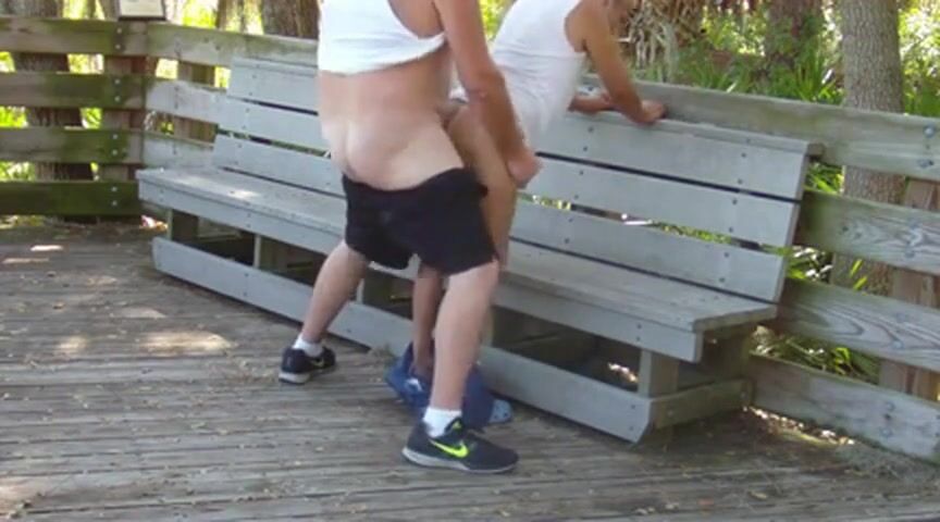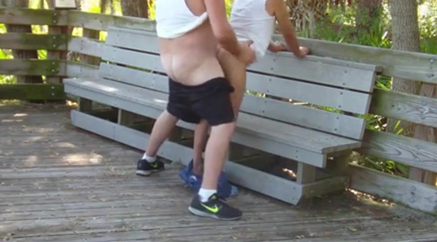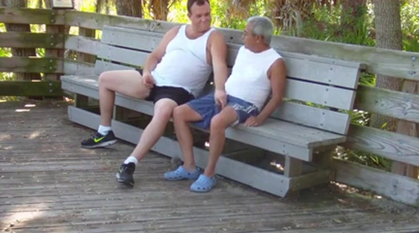 Two older gay men, one Caucasian and one of color, engage in passionate bareback sex in a public park, their desire and lust on full display as they take turns giving and receiving pleasure outdoors, unaware or unbothered by the possibility of onlookers.
