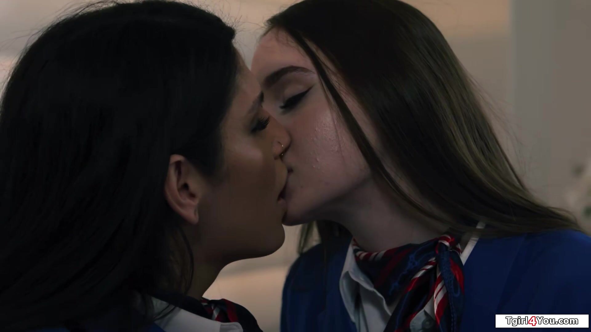 Shemale flight attendant Zariah Aura and her busty colleague Hazel Moore stay the night.The latin tgirl masturbates the brunette while she gets her big cock deepthroated.The small tits tranny licks the big boobs babes hairy pussy and fucks her