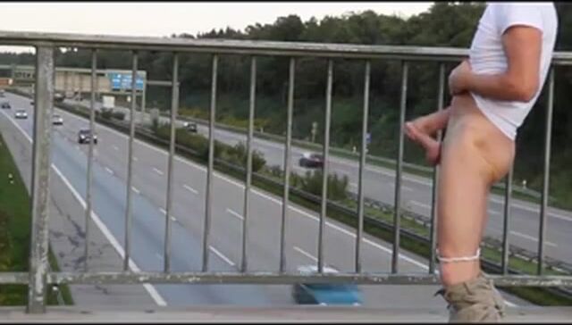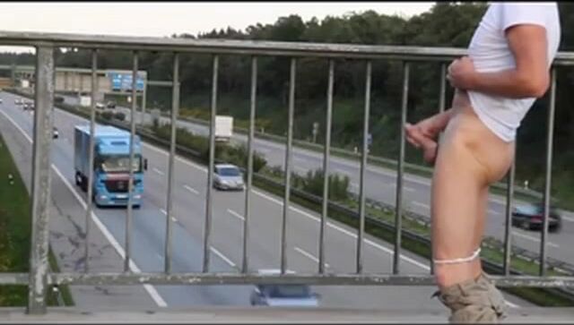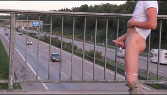 Description: auf der Autobahnbrücke den steifen Schwanz gewichst sodass alle sehen konnten wie das Sperma in hohem Bogen gespritzt ist.